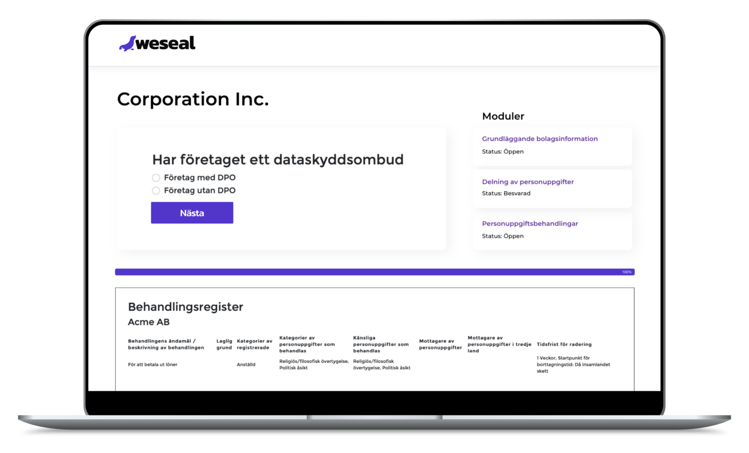 Weseal är byggt för att ta dig dig steg-för-steg igenom hela din dataskyddsimplementering och hjälper dig och din organisation att hålla skyddet uppdaterat efter behov. Det ska vara lätt att göra rätt — och fortsätta göra rätt.
