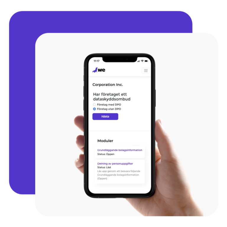 Weseal är en frågebaserad och spelinspirerad tjänst för allt ditt dataskyddsarbete. Du som användare behöver inte vara specialist inom dataskydd för att använda den. Tvärtom, språket är enkelt och avkodat från juridiska.